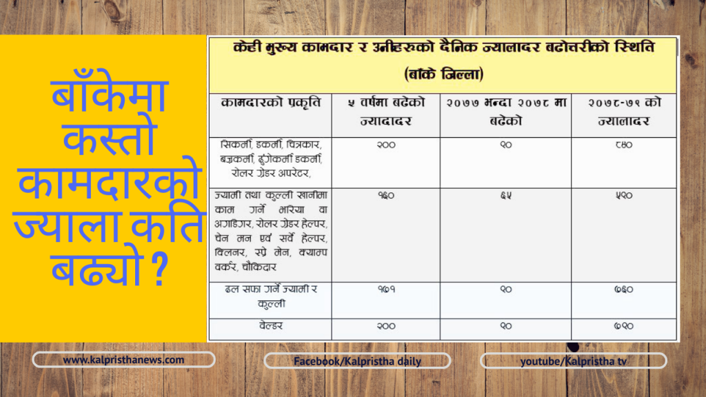 बाँके जिल्लामा विगत पाँच वर्षमा श्रमिकहरुको तलबमा २६ देखि ३१ प्रतिशतसम्म बढोत्तरी भएको छ । जिल्ला दररेट निर्धारण समितिले हरेक वर्ष निर्धाण गर्ने ज्यालाको तथ्यांक तुलना गर्दा ३१ प्रतिशत सम्मले बढोत्तरी भएको पाइएको हो ।