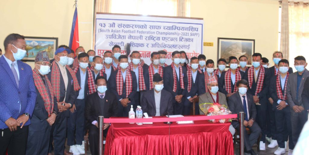 १३ औं संस्करणको साफ च्याम्पीयनसिप प्रतियोगितामा उपविजेता हुन सफल नेपाली राष्ट्रिय फुटबल टिमका खेलाडी तथा प्रशिक्षकलाई पुरस्कार वितरण गरिएको छ । प्रधानमन्त्रीको सरकारी निवास बालुवाटारमा आयोजित विशेष कार्यक्रममा प्रधानमन्त्री शेरबहादुर देउवा र युवा तथा खेलकुद मन्त्री महेश्वरजंग गहतराज (अथक) ले साफ उपविजेता टिमका खेलाडीहरुलाई जनही पाँच लाख नगदसहित सम्मान गरेका हुन् ।