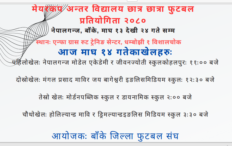 नेपालगन्जमा शनिबार देखि सुरु भएको मेयर कप अन्तर विद्यालय छात्र–छात्र फुटबल प्रतियोगितामा आज आइतबार चार वटा खेल हुँदैछन ।